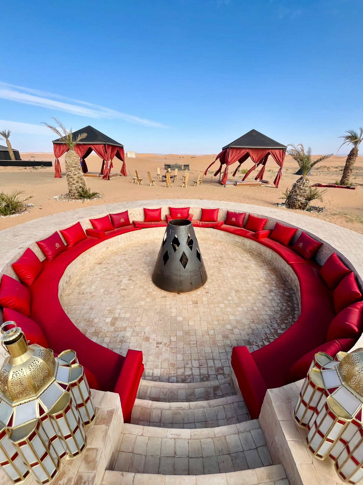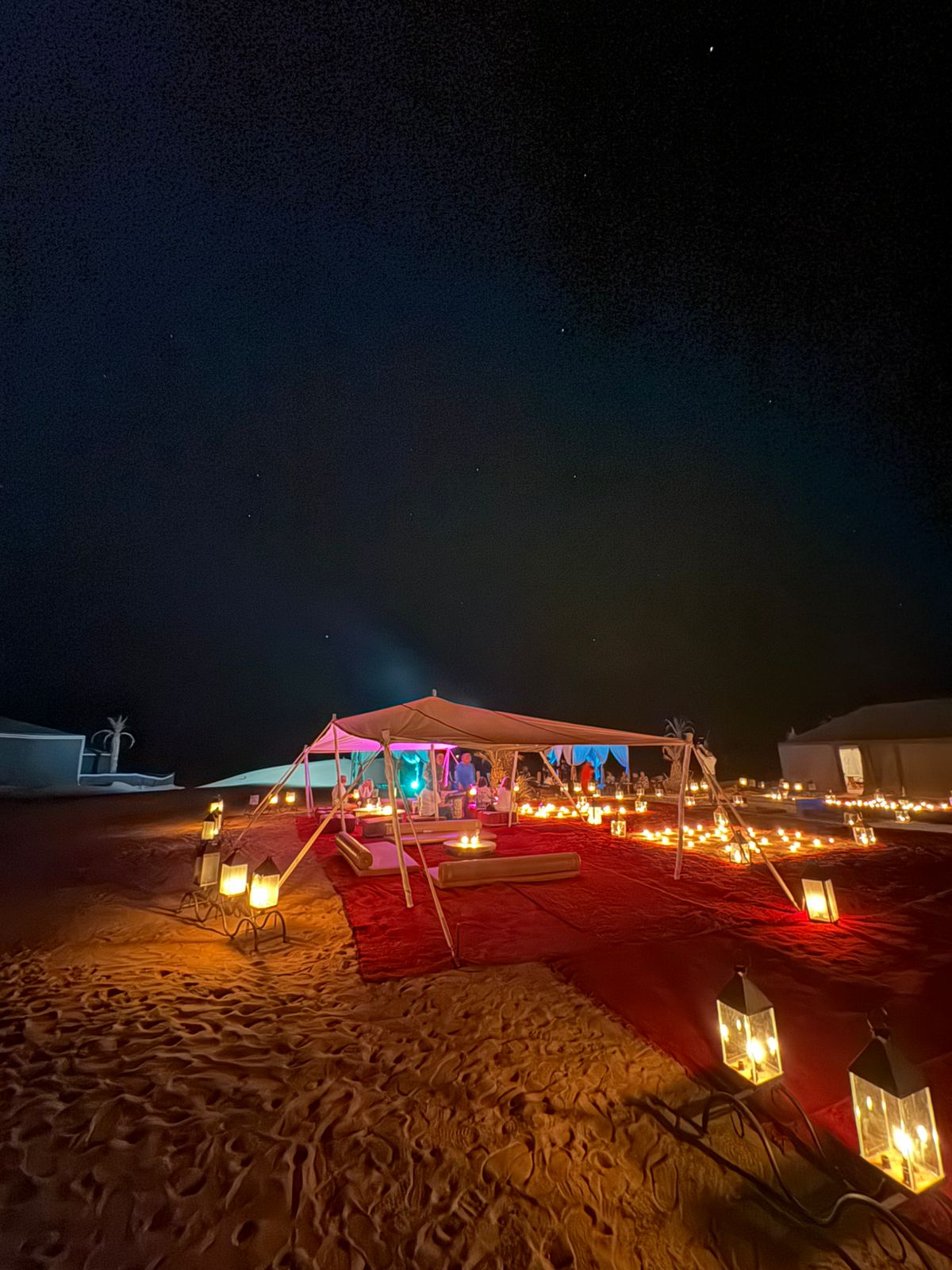Local ambiance with traditional Gnawa rhythms and fire animation around the campfire.